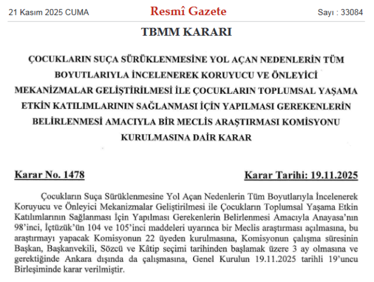 ANKARA (İGFA) – Türkiye Büyük Millet Meclisi (TBMM), çocuk suçluluğuna karşı önemli bir adım attı. Anayasa’nın 98’inci ve TBMM İçtüzüğü’nün 104-105’inci maddeleri uyarınca, çocukların suça sürüklenmesine neden olan faktörlerin tüm boyutlarıyla araştırılması, önleyici mekanizmaların oluşturulması ve çocukların toplumsal yaşama etkin entegrasyonunun sağlanması amacıyla Meclis Araştırma Komisyonu kurulmasına dair karar, bugünkü Resmi Gazete’de yayımlandı.