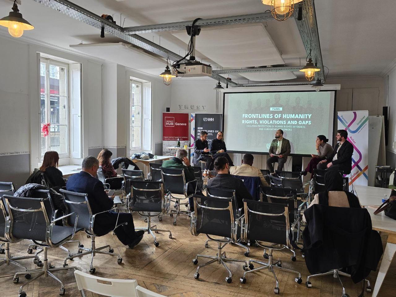İHH, Cenevre’de Birleşmiş Milletler Genel Merkezi Binası’nın önünde düzenlediği basın açıklaması öncesinde Impact Hub Grand Salon’da düzenlediği panelde, çatışma bölgelerinde görev yapan insani yardım çalışanları ve insan hakları savunucularının karşı karşıya kaldığı artan riskler, uluslararası hukuk çerçevesinde mevcut koruma mekanizmaları ve sahadaki uygulamalarda görülen yapısal boşluklar kapsamlı biçimde ele alındı. Panel; İrfan Tatlı’nın moderatörlüğünde yapılırken, uluslararası yardım kuruluşu Oxfam’ın Cenevre Direktörü Mathew Truscott, İngiltere’deki Kent Üniversitesinden akademisyen Shahd Hammouri, Filistin için Adalet Kuruluşunda araştırma direktörü ve Avukat Henriette Willberg ile Yeryüzü Avukatları Derneğinden avukat Hüseyin Dişli konuşmacı olarak katıldı. Panelin ardından, çatışma bölgelerinde görev yapan insani yardım çalışanları ve insan hakları savunucularına yönelik ağırlaşan hak ihlallerine ilişkin uluslararası topluma çağrıda bulunmak amacıyla Birleşmiş Milletler Cenevre Ofisi (UNOG) Palais des Nations önü – Broken Chair yanındaki alanda basın açıklaması yapıldı. Açıklamayı İHH Mütevelli Heyeti Üyesi Uğur Yıldırım yaptı.